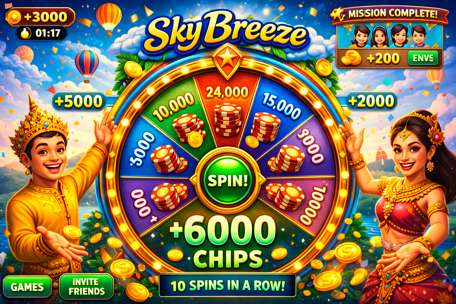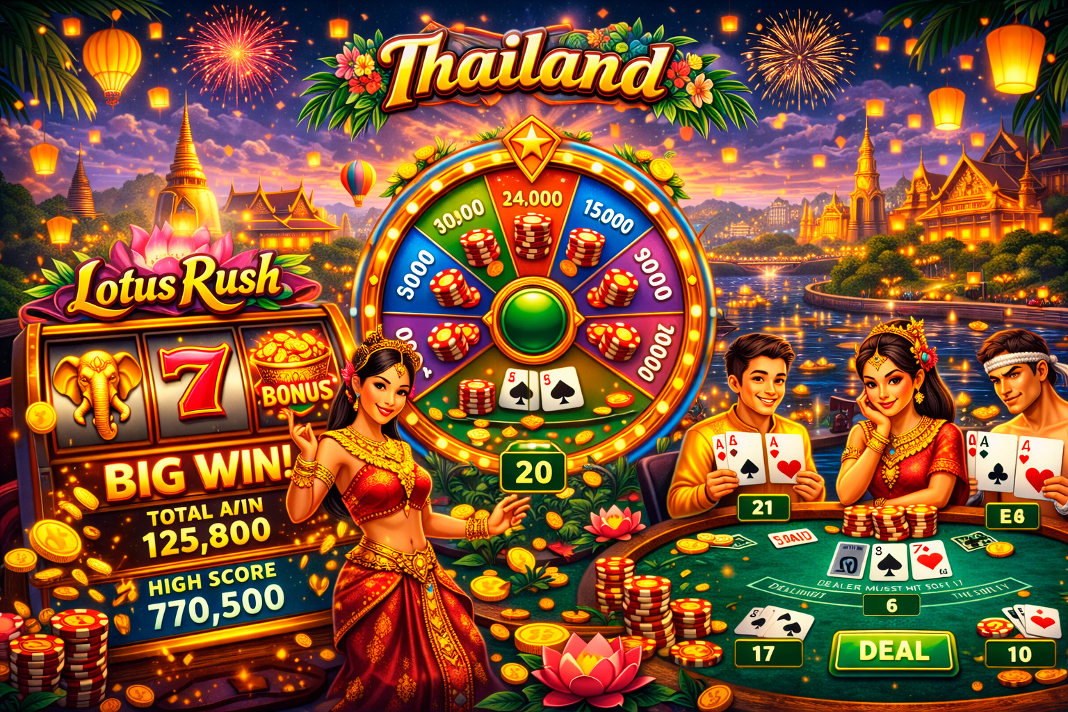 หมุนรีล 3 ช่องกับธีมเมืองไทย เติมจังหวะสนุกด้วยสัญลักษณ์ดอกบัว ช้าง และวัด ใช้ชิปเสมือนเพื่อแข่งขันในกลุ่มเพื่อน